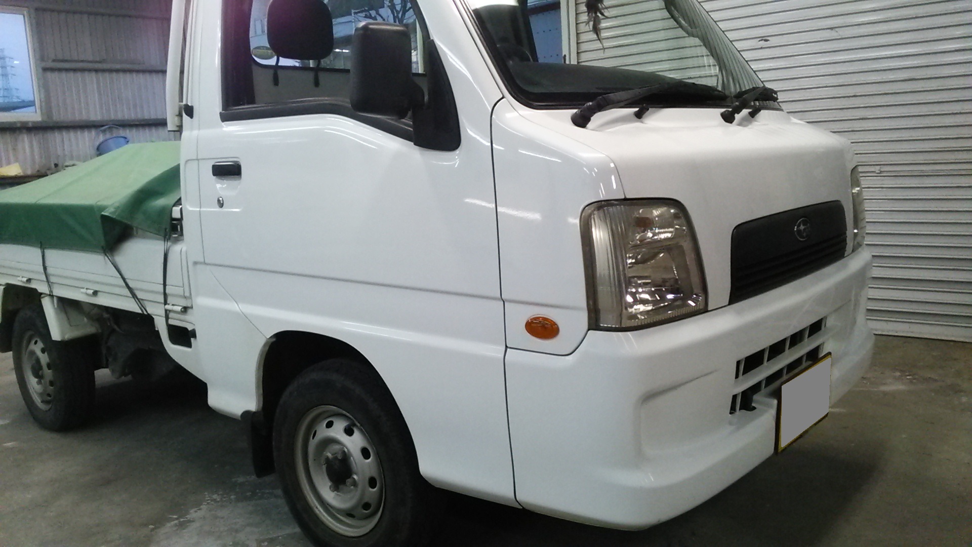 藤沢市からご来店・サンバー フロントドア フェンダー へこみ 傷 板金塗装修理